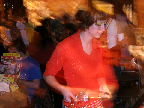 ( 10.30.05) - overcrowded and badly organized on the main floor, but a fun event nonetheless, full of youthful energy and alt-scene eye candy... a good day to be working a booth, sitting and watching all the people pass by; too bad I can't take in more upper level activities (the real gems today are up there). - though most here are obsessed with the current wave of disposable fanzine-production, I lived through and participated in the original fanzine movement (put it this way: I know what Factsheet Five is) and unfortunately see little here that really seems inspired or new on the photocopy front (sort of an outsider opinion for this room, I realize) - what I do find noteworthy is a singular vendor who is selling off parts of a great collection of old canadian rarities: I pick up two extremely rare 'visual novels' by Martin Vaughn-James (The Cage and The Projector) beautiful hardcover books released by Coach House Press in the early 70's! A steal at $40. • |